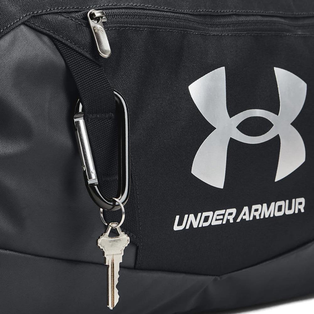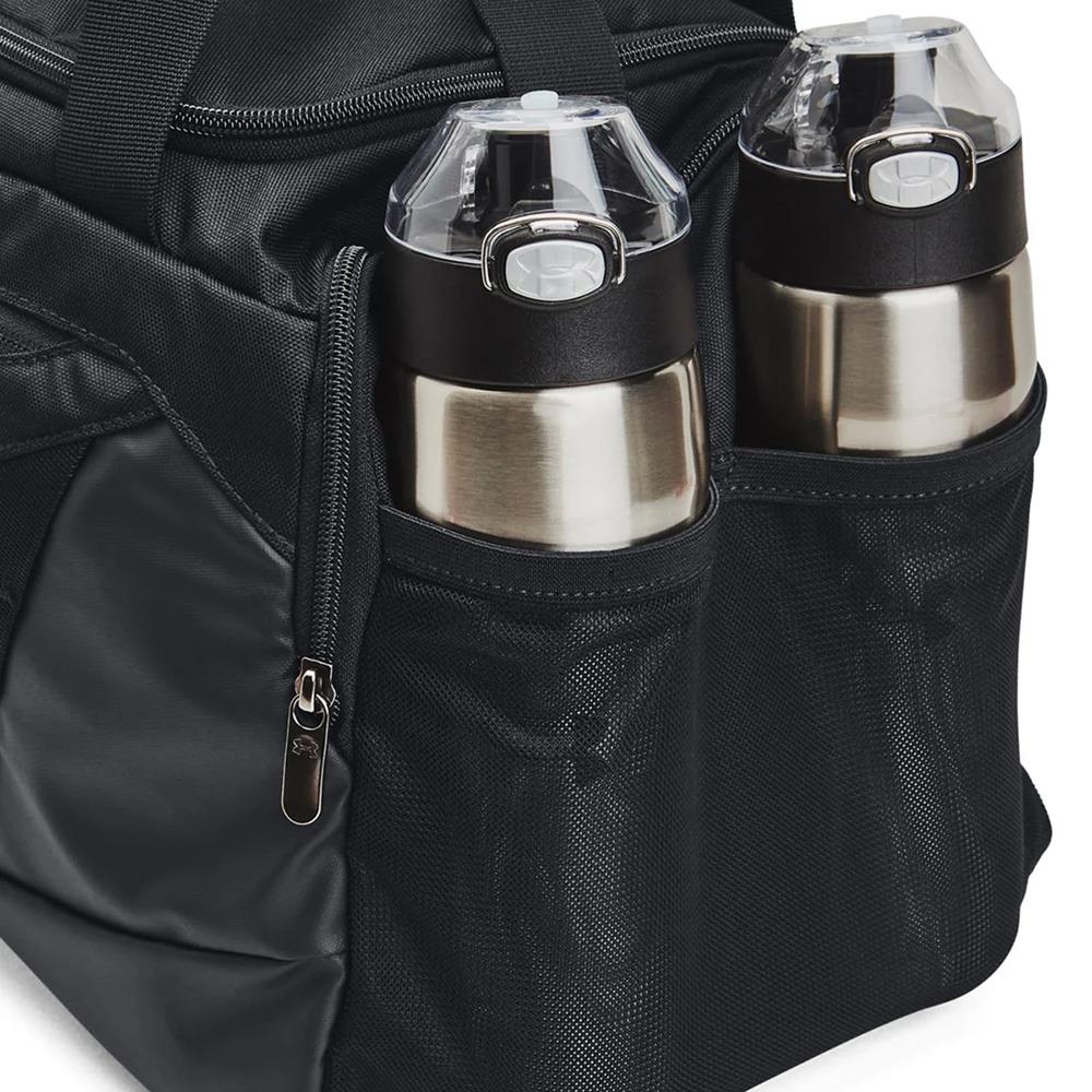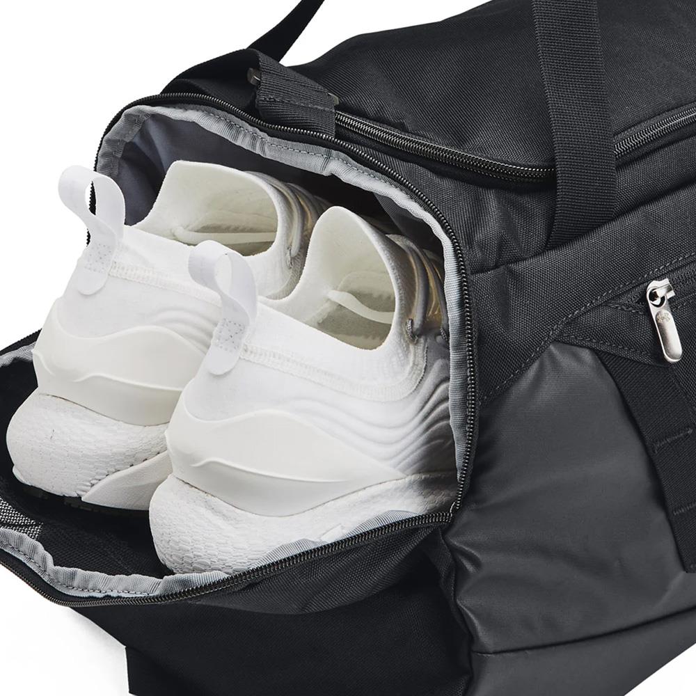 Its called small but you can get lots into this UA Undeniable Duffle 5.0 bag. Made with UA Storm technology this bag delivers an element-battling, highly water-resistant finish. With lots of inner room and 2 large front zippered pockets for all your smaller items you'll be using this all the time. UA Storm technology delivers an element-battling, highly water-resistant finish. Tough, abrasion-resistant bottom and side panels. 2 large front zippered organization pockets. Adjustable shoulder strap. Dual water boittle slip pocket Padded top grab handle. Large vented pocket for laundry or shoes and internal slip pockets for organization. D-Ring for additional attachment point. Dimensions when full: 10.6"W x 21.7"H x 11.2"L 100% Polyester Size: One Size